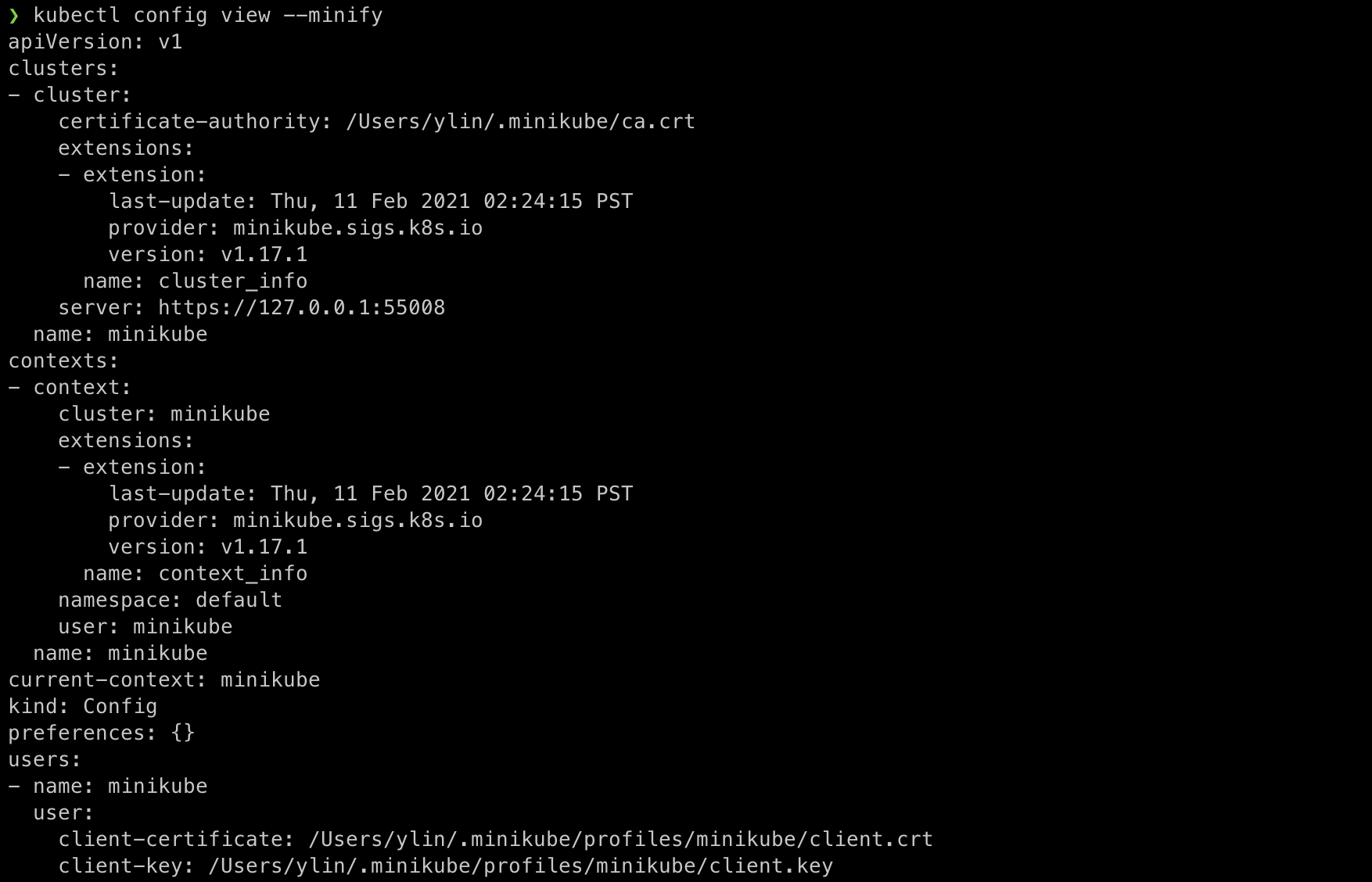 首先 minikube 使用 environment variable KUBECONFIG 找到了我的 kubeconfig。